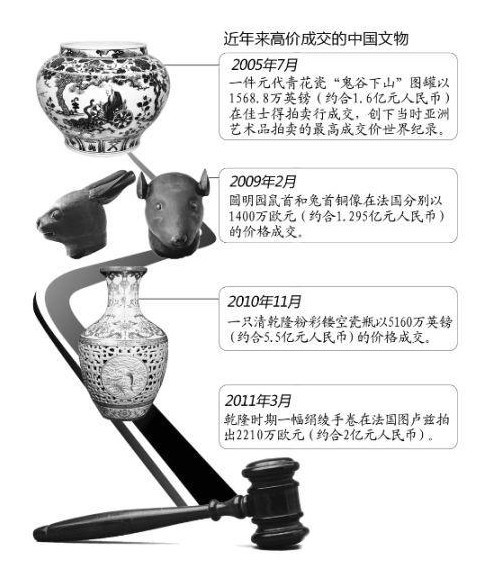 據(jù)聯(lián)合國教科文組織統(tǒng)計,流失到中國境外的中國文物約164萬件,分散在全世界47家博物館,海外民間的收藏預計是館藏的10倍。近年來,中國文物成了拍賣市場的搶手貨,價格動輒上千萬。