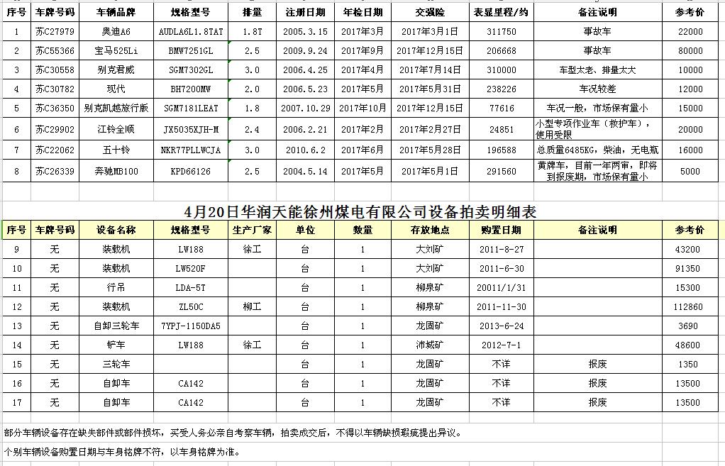華潤(rùn)天能徐州煤電有限公司車輛拍賣明細(xì)表
