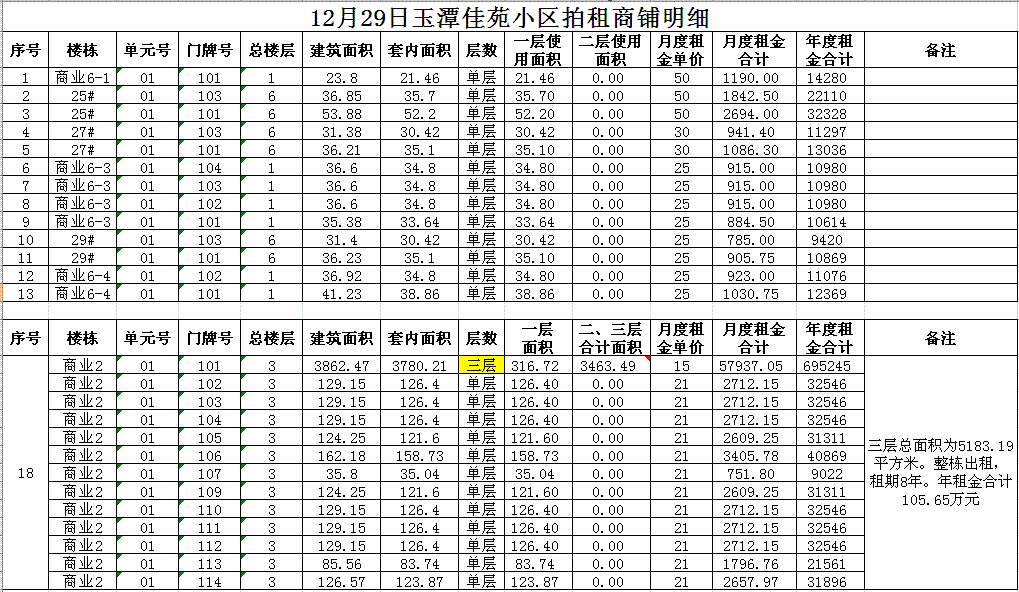 拍租門面房共有數(shù)十套,均為空房,房屋面積分別為數(shù)十至數(shù)百平方米不等。租賃期限均為3年。