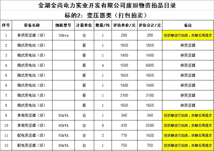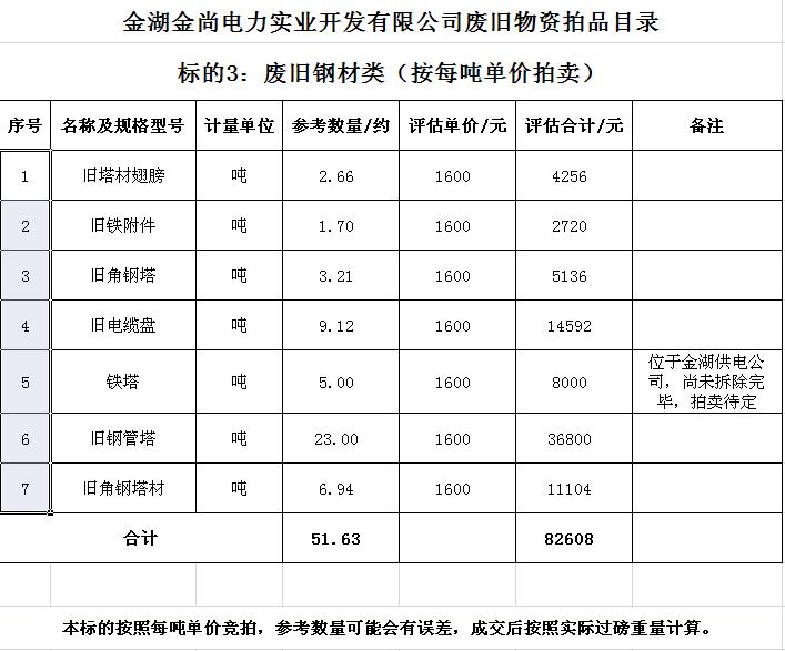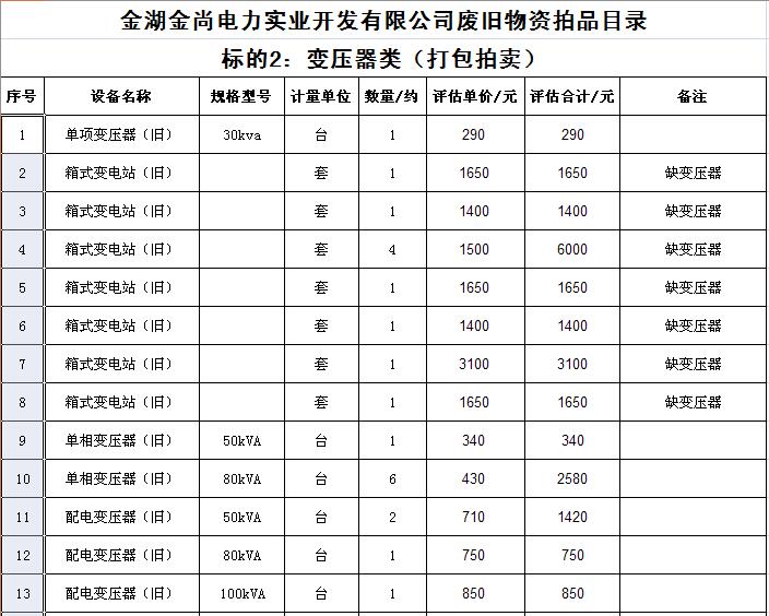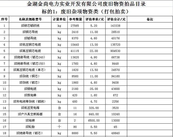 關(guān)注微信公眾號受金湖金尚電力實(shí)業(yè)開發(fā)有限公司委托,我公司將通過中國拍賣行業(yè)協(xié)會網(wǎng)絡(luò)拍賣平臺以網(wǎng)絡(luò)競價的方式公開拍賣廢舊物資一批,主要包括:電纜、導(dǎo)線、鋼芯鋁絞線、角鋼塔、鐵附件、金具、變壓器、箱式變電站、空調(diào)、電腦等(詳見拍品目錄)。