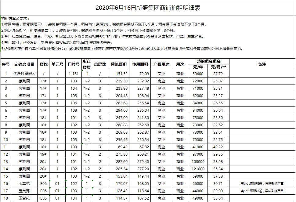 即日起展示。有意者請攜帶有效證件至我公司辦理報名手續(xù),并交納每間商鋪2萬元競拍保證金即可參加拍賣會,報名截止至6月15日16時。